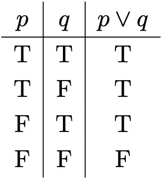 In the previous post, we introduced what we mean by logic, which agrees largely with our intuitive process of making sense of the world. We defined truth values, negations, and conjunctions. The parallel to the conjunction is the disjunction, defined as follows.