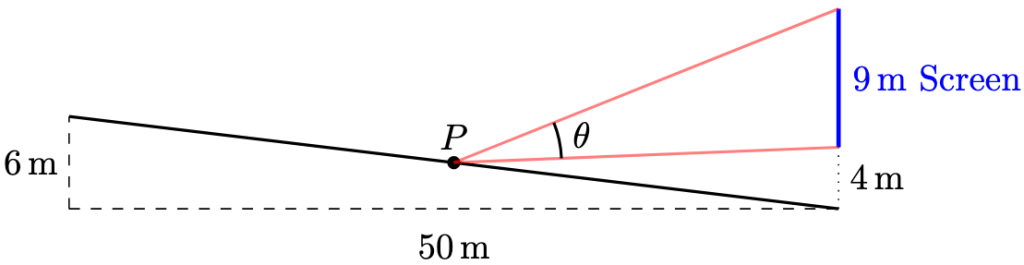 Question 2. The diagram below shows a movie theatre with a screen tall, whose base is