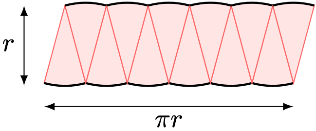 Here, we use sub-divisions for convenience. We notice that the areas total to the circle area. By rearranging these sectors, we recover an approximate rectangle with approximate base