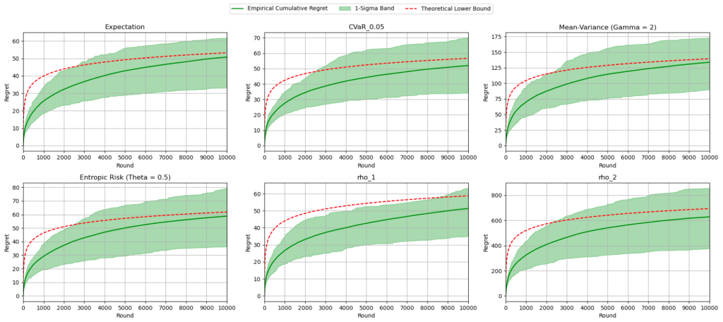 The red curve indicates the theoretical asymptotic lower bound, and each diagram reflects the algorithm running for a fixed -armed Bernoulli bandit, with different risk functionals, even combinations of them: